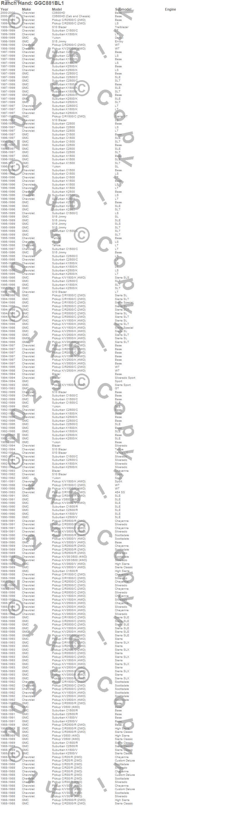 Below is an abbreviated list of applications for the Legend Series Grille Guard.Blazer, C1500 Pickup, C1500 Suburban, C2500 Pickup, C2500 Suburban, C3500 Pickup, C3500HD, K1500, K1500 Pickup, K1500 Suburban, K2500 Pickup, K2500 Suburban, K3500 Pickup, R1500 Suburban, R20 Pickup, R2500 Pickup, R2500 Suburban, R30 Pickup, R3500 Pickup, S10 Blazer