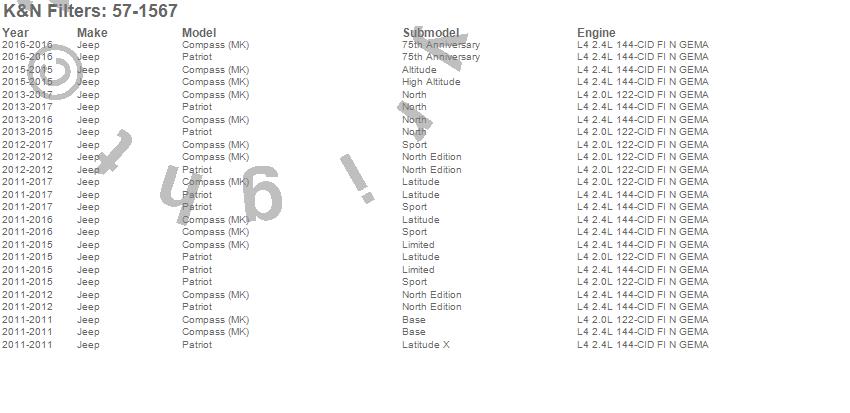 Below is an abbreviated list of applications for the Filtercharger Injection Performance Kit.Compass, Patriot, Jeep, 2015, 2014, 2013, 2012, 2011
