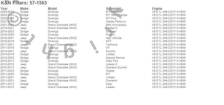 Below is an abbreviated list of applications for the Filtercharger Injection Performance Kit.Durango, Grand Cherokee, Dodge, Jeep, 2016, 2015, 2014, 2013, 2012, 2011
