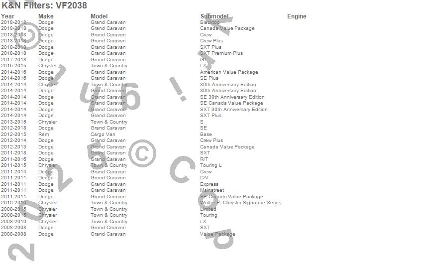 Below is an abbreviated list of applications for the Cabin Air Filter.C/V, Grand Caravan, Town & Country, Chrysler, Dodge, Ram, 2018, 2017, 2016, 2015, 2014, 2013, 2012, 2011, 2010, 2009, 2008