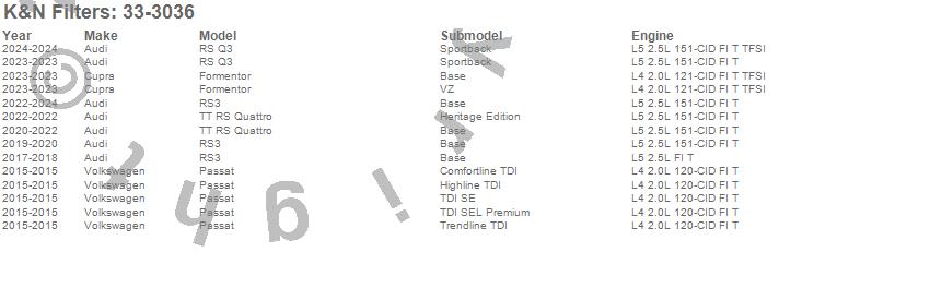 Below is an abbreviated list of applications for the Air Filter.Passat, RS3, Audi, Volkswagen, 2018, 2017, 2015