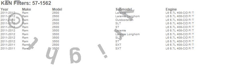 Below is an abbreviated list of applications for the Filtercharger Injection Performance Kit.2500, 3500, Ram, 2012, 2011