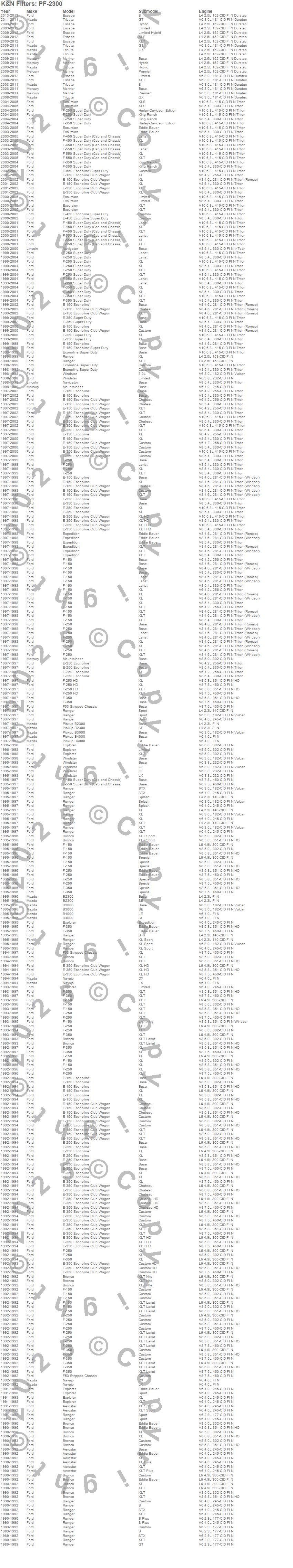 Below is an abbreviated list of applications for the In-Line Gas Filter.Aerostar, B2300, B3000, B4000, Bronco, E-150 Econoline, E-150 Econoline Club Wagon, E-250 Econoline, E-350 Econoline, E-350 Econoline Club Wagon, E-350 Super Duty, E-450 Econoline Super Duty, E-550 Econoline Super Duty, Econoline Super Duty, Escape, Excursion, Expedition, Explorer, F-150, F-250
