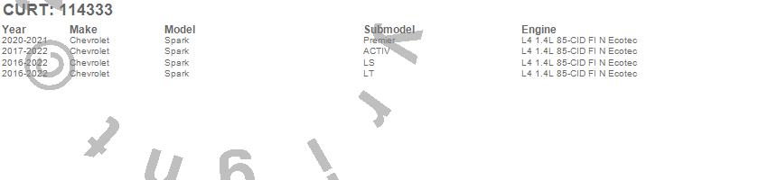Below is an abbreviated list of applications for the Class I 1.25 in. Receiver Hitch.Spark, Chevrolet, 2022, 2021, 2020, 2019, 2018, 2017, 2016