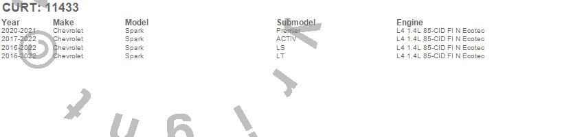 Below is an abbreviated list of applications for the Class I 1.25 in. Receiver Hitch.Spark, Chevrolet, 2022, 2021, 2020, 2019, 2018, 2017, 2016