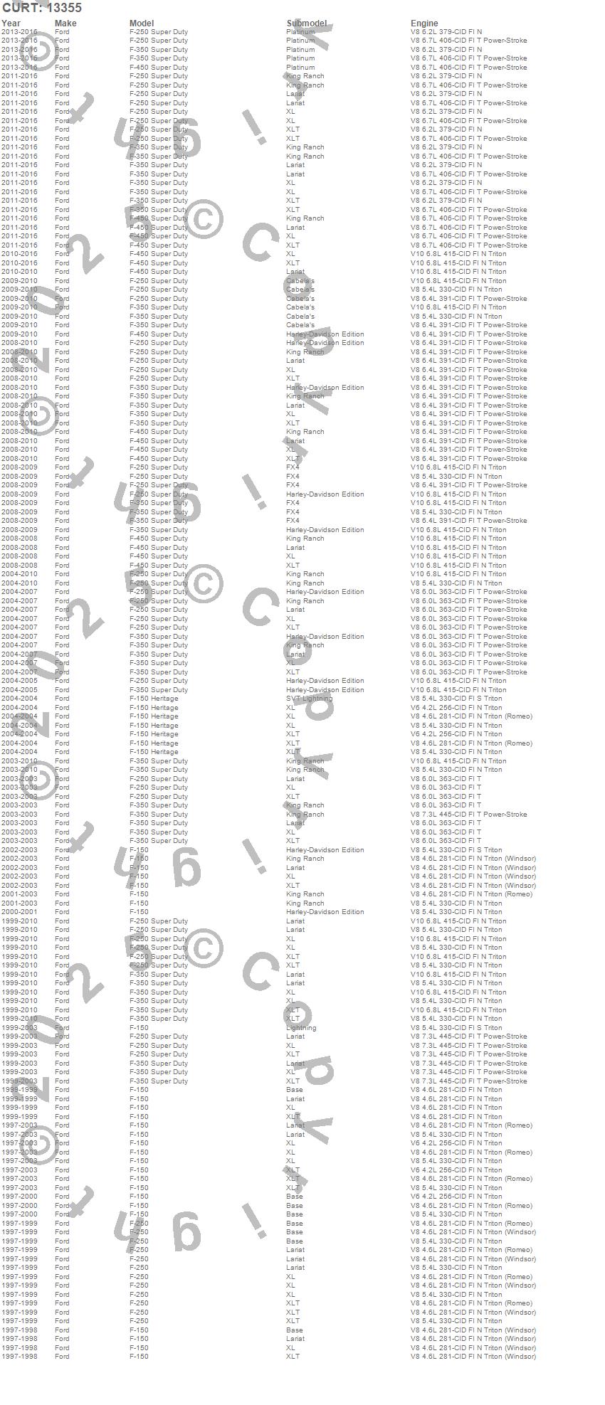 Brand: CURTPart Number: 13355Trailer Hitch Type: Rear - 6000lbs. Gross Trailer Weight - 600lbs. Tongue Weight - 10000lbs. Weight Distributing - 1000lbs. Weight Distributing Tongue WeightUPC: 612314133550