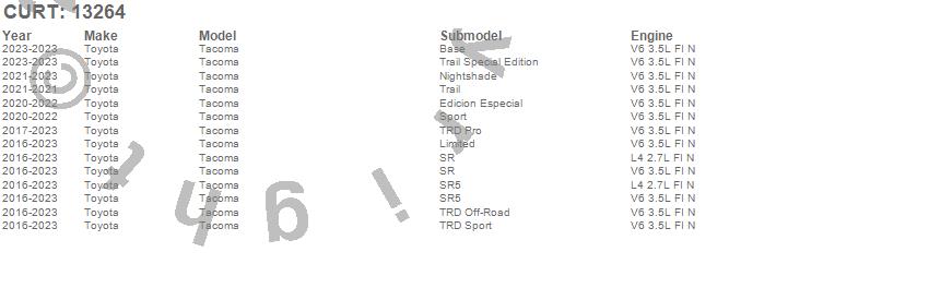 Below is an abbreviated list of applications for the Class III 2 in. Receiver Hitch.Tacoma, Toyota, 2023, 2022, 2021, 2020, 2019, 2018, 2017, 2016