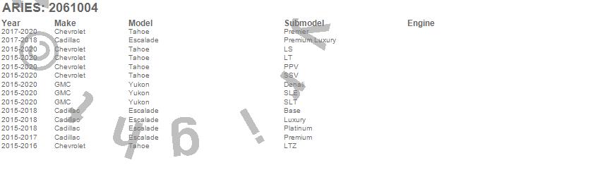 Below is an abbreviated list of applications for the AeroTread Running Boards w/Mounting Brackets.Escalade, Tahoe, Yukon, Cadillac, Chevrolet, GMC, 2020, 2019, 2018, 2017, 2016, 2015