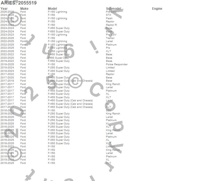 Below is an abbreviated list of applications for the RidgeStep Commercial Running Boards w/Mounting Brackets.F-150, F-150 Lightning, F-250 Super Duty, F-350 Super Duty, F-450 Super Duty, F-550 Super Duty, F450 Super Duty, Ford, 2026, 2025, 2024, 2023, 2022, 2021, 2020, 2019, 2018, 2017, 2016, 2015