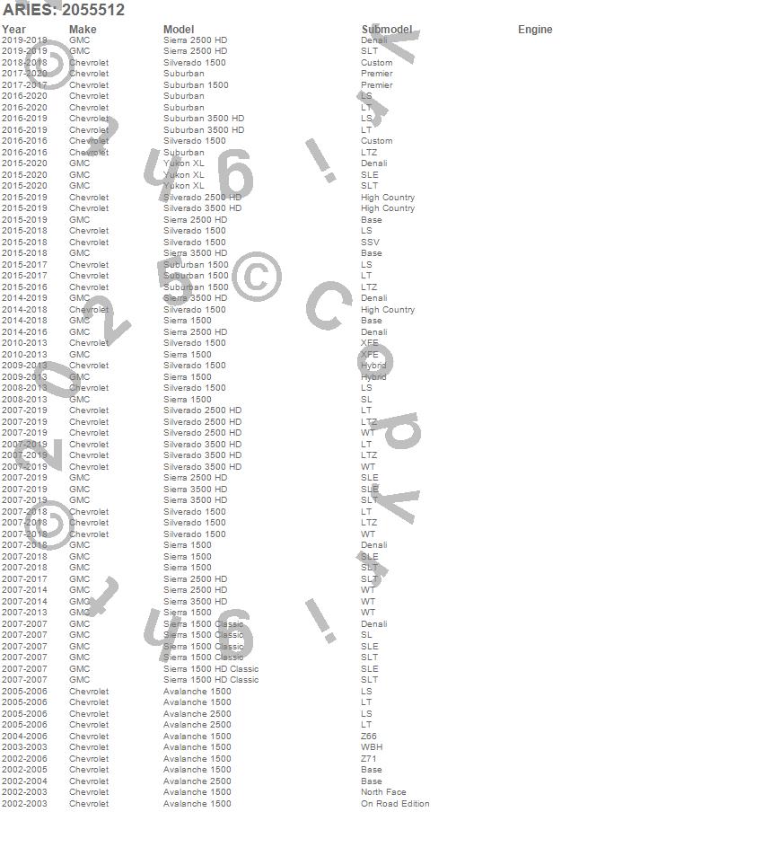 Below is an abbreviated list of applications for the RidgeStep Commercial Running Boards w/Mounting Brackets.Avalanche 1500, Avalanche 2500, Sierra 1500, Sierra 1500 Classic, Sierra 1500 HD Classic, Sierra 2500 HD, Sierra 3500 HD, Silverado 1500, Silverado 2500 HD, Silverado 3500 HD, Suburban, Suburban 1500, Suburban 3500 HD, Yukon XL, Chevrolet, GMC, 2020, 2019, 2018, 2017