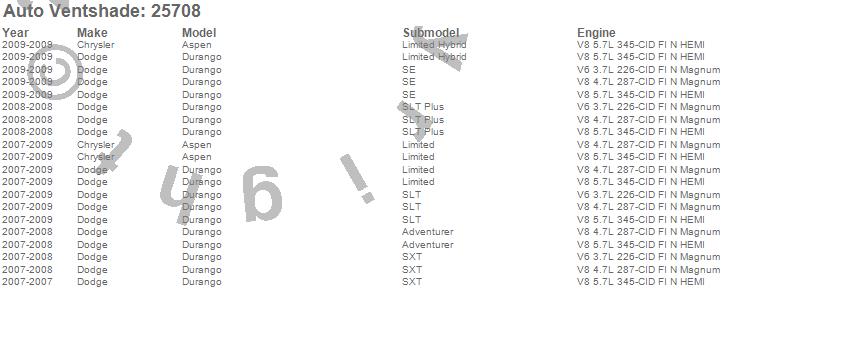 Below is an abbreviated list of applications for the Bugflector II Stone/Bug Deflector.Aspen, Durango, Chrysler, Dodge, 2009, 2008, 2007