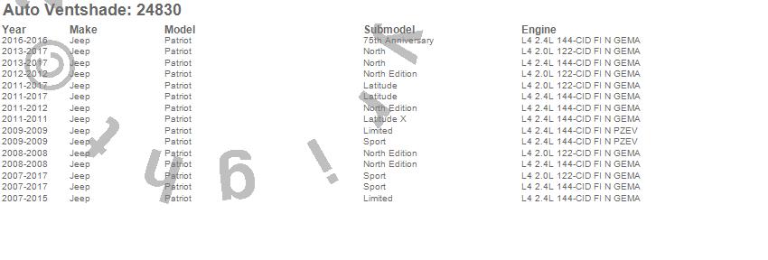 Below is an abbreviated list of applications for the Bugflector II Stone/Bug Deflector.Patriot, Jeep, 2017, 2016, 2015, 2014, 2013, 2012, 2011, 2010, 2009, 2008, 2007