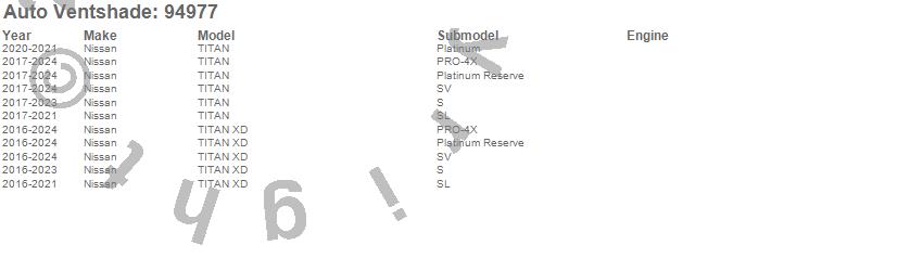 Below is an abbreviated list of applications for the Ventvisor Deflector 4 pc..TITAN, TITAN XD, Nissan, 2024, 2023, 2022, 2021, 2020, 2019, 2018, 2017, 2016
