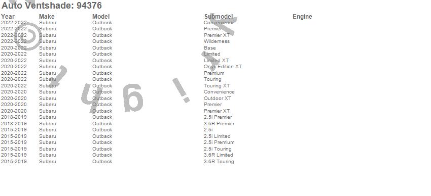 Below is an abbreviated list of applications for the Ventvisor Deflector 4 pc..Outback, Subaru, 2022, 2021, 2020, 2019, 2018, 2017, 2016, 2015