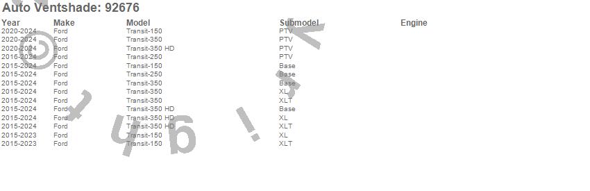 Below is an abbreviated list of applications for the Ventvisor Deflector 2 pc..Transit-150, Transit-250, Transit-350, Transit-350 HD, Ford, 2026, 2024, 2023, 2022, 2021, 2020, 2019, 2018, 2017, 2016, 2015