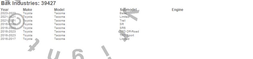 Brand: BAK IndustriesPart Number: 39427Tonneau Cover Type: Black - Vinyl Top w/ Aluminum Underside - Leather Grain FinishUPC: 819275028080