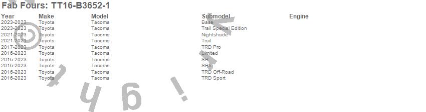 Brand: Fab FoursPart Number: TT16-B3652-1Bumper- Front Type: 2 Stage Black Powder Coated - w/PreRunner Grill GuardUPC: 005810111793