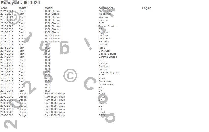 Below is an abbreviated list of applications for the Front Leveling Kit.1500, 1500 Classic, Ram 1500, Dodge, Ram, 2024, 2023, 2022, 2021, 2020, 2019, 2018, 2017, 2016, 2015, 2014, 2013, 2012, 2011, 2010