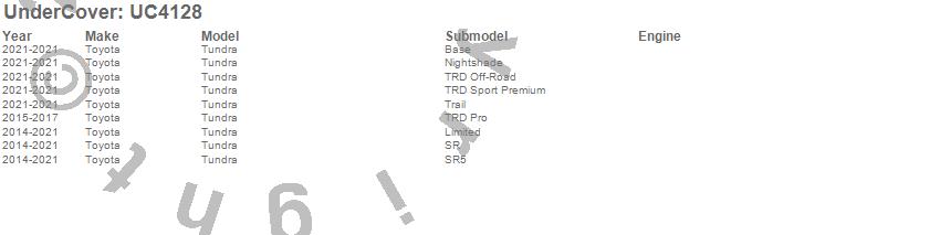 Brand: UnderCoverPart Number: UC4128Tonneau Cover Type: Black TexturedUPC: 897197011243