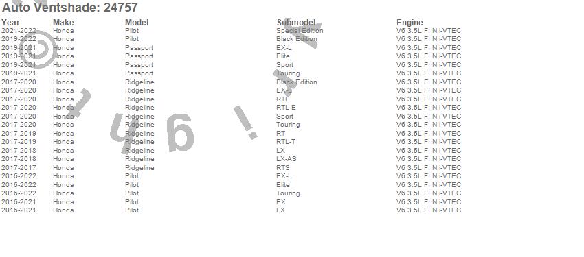 Below is an abbreviated list of applications for the Bugflector II Stone/Bug Deflector.Passport, Pilot, Ridgeline, Honda, 2022, 2021, 2020, 2019, 2018, 2017, 2016