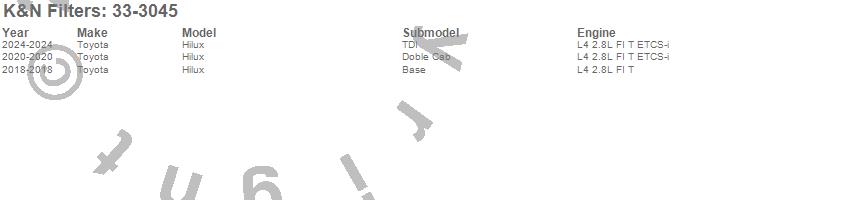 Below is an abbreviated list of applications for the Air Filter.Hilux, Toyota, 2018