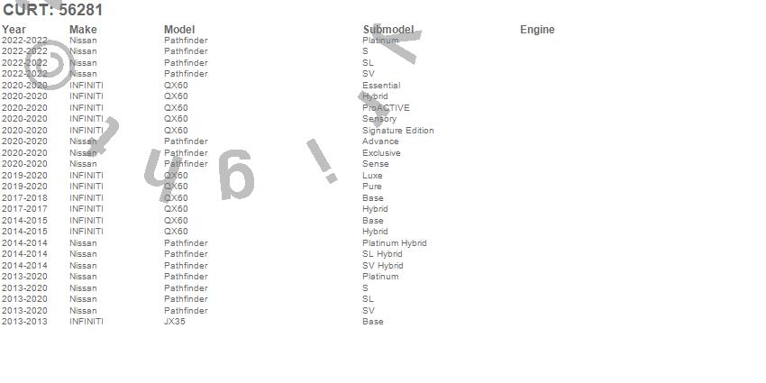 Below is an abbreviated list of applications for the Vehicle To Trailer Connector w/Harness.Pathfinder, QX60, Infiniti, Nissan, 2017, 2016, 2015, 2014, 2013
