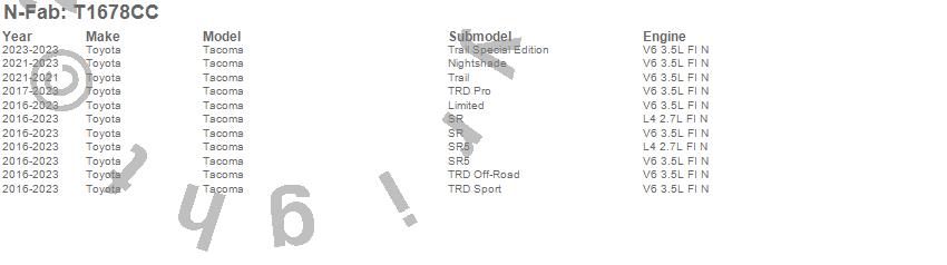 Below is an abbreviated list of applications for the Cab Length Nerf Step Bar.Tacoma, Toyota, 2023, 2022, 2021, 2020, 2019, 2018, 2017, 2016