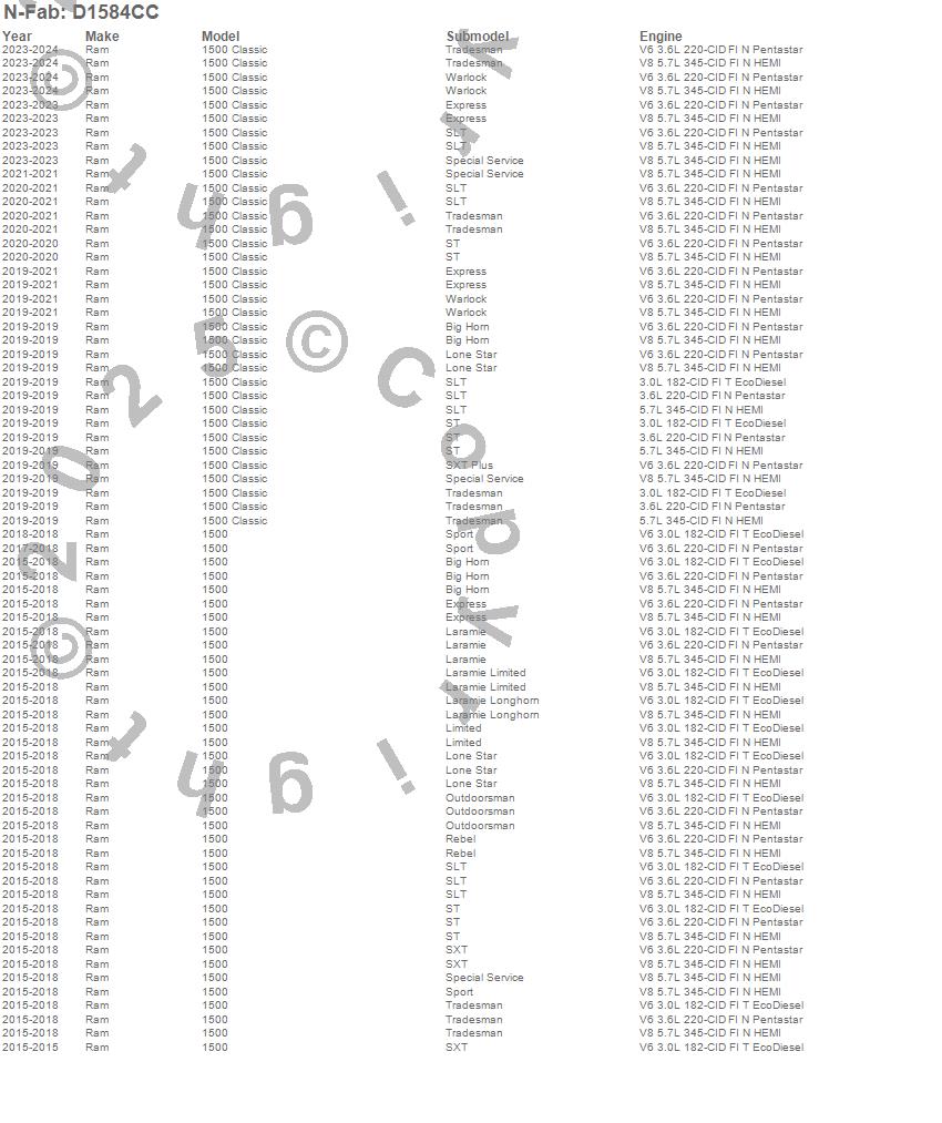 Below is an abbreviated list of applications for the Cab Length Nerf Step Bar.1500, 1500 Classic, Ram, 2024, 2023, 2021, 2020, 2019, 2018, 2017, 2016, 2015