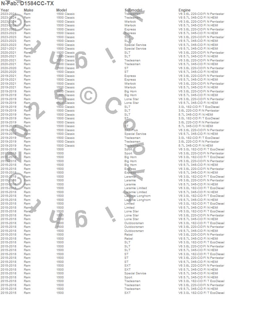 Below is an abbreviated list of applications for the Cab Length Nerf Step Bar.1500, 1500 Classic, Ram, 2024, 2023, 2021, 2020, 2019, 2018, 2017, 2016, 2015
