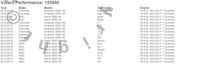 Below is an abbreviated list of applications for the Cold Air Intake Kit.Sierra 2500 HD, Sierra 3500 HD, Silverado 2500 HD, Silverado 3500 HD, Chevrolet, GMC, 2016, 2015, 2014, 2013