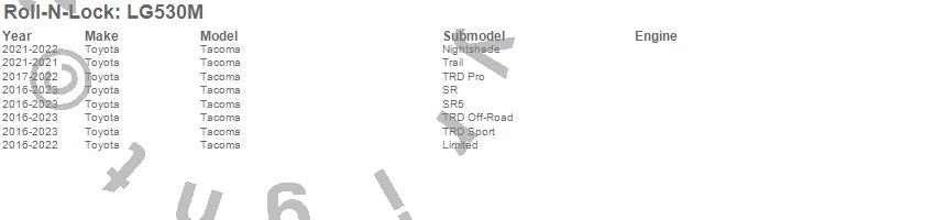 Below is an abbreviated list of applications for the Roll-N-Lock M-Series Truck Bed Cover.Tacoma, Toyota, 2023, 2022, 2021, 2020, 2019, 2018, 2017, 2016