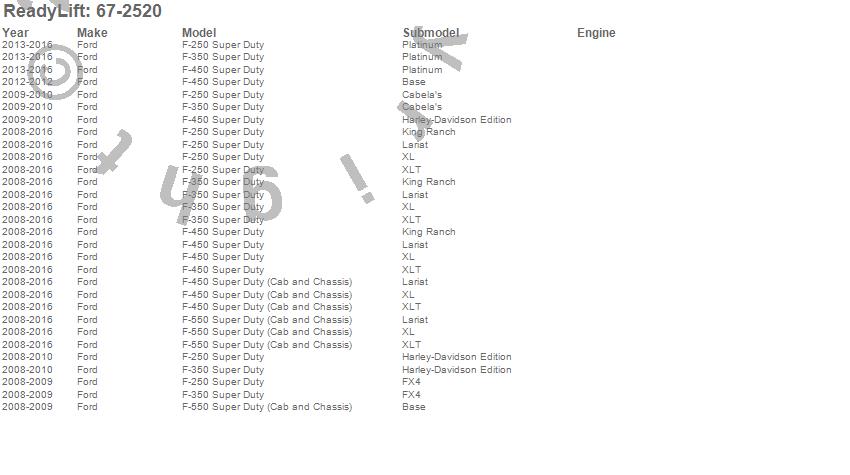 Below is an abbreviated list of applications for the Bump Stop Spacer.F-250 Super Duty, F-350 Super Duty, F-450 Super Duty, F-550 Super Duty, Ford, 2016, 2015, 2014, 2013, 2012, 2011, 2010, 2009, 2008