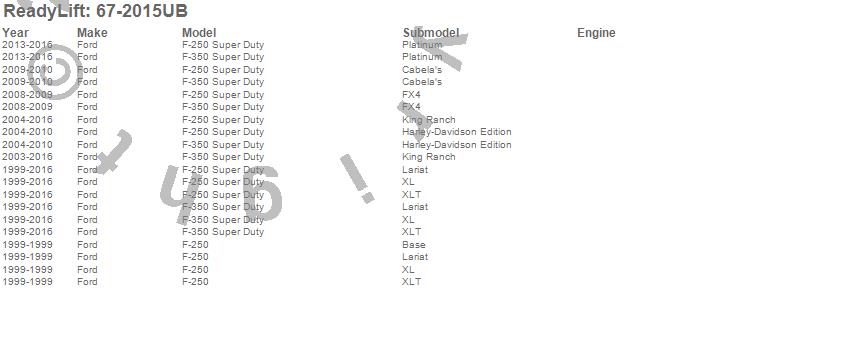 Below is an abbreviated list of applications for the Long U Bolt Kit.F-250, F-250 Super Duty, F-350 Super Duty, Ford, 2016, 2015, 2014, 2013, 2012, 2011, 2010, 2009, 2008, 2007, 2006, 2005, 2004, 2003, 2002, 2001