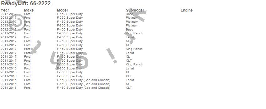 Below is an abbreviated list of applications for the Rear Block Kit.F-250 Super Duty, F-350 Super Duty, F-450 Super Duty, Ford, 2017, 2016, 2015, 2014, 2013, 2012, 2011