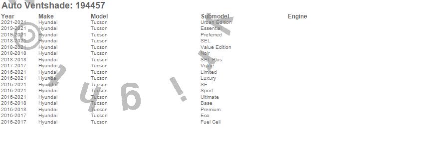 Below is an abbreviated list of applications for the Ventvisor In-Channel Deflector 4 pc..Tucson, Hyundai, 2021, 2020, 2019, 2018, 2017, 2016