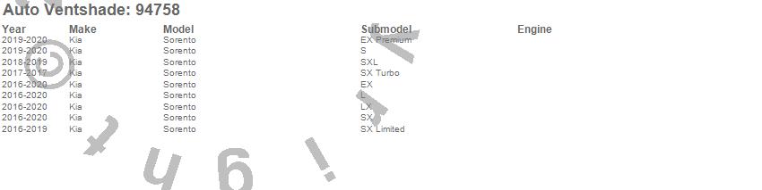 Below is an abbreviated list of applications for the Ventvisor Deflector 4 pc..Sorento, Kia, 2020, 2019, 2018, 2017, 2016