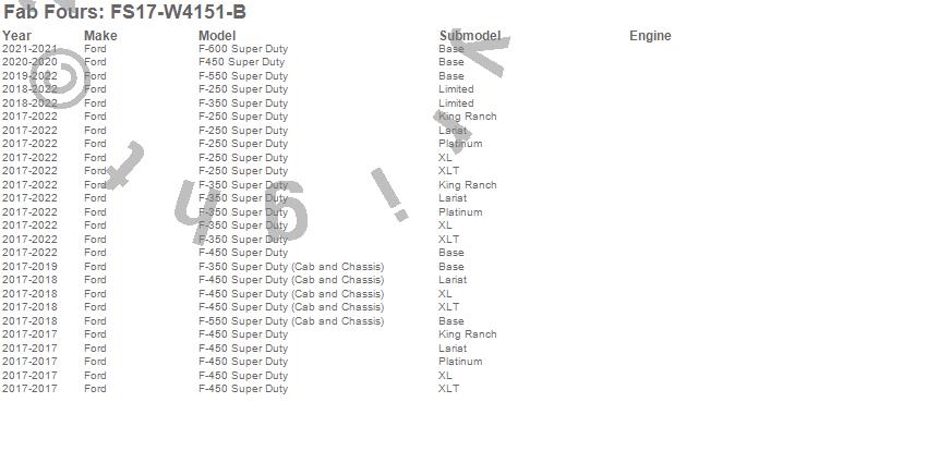 Below is an abbreviated list of applications for the Premium Rear Bumper.F-250 Super Duty, F-350 Super Duty, F-450 Super Duty, F-550 Super Duty, F-600 Super Duty, F450 Super Duty, Ford, 2022, 2021, 2020, 2019, 2018, 2017