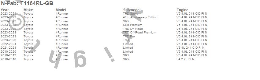 Below is an abbreviated list of applications for the Wheel To Wheel Nerf Step Bar.4Runner, Toyota, 2024, 2023, 2022, 2021, 2020, 2019, 2018, 2017, 2016, 2015, 2014, 2013, 2012, 2011, 2010