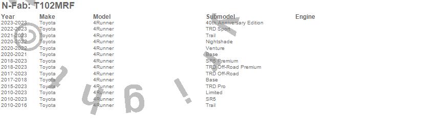 Brand: N-FabPart Number: T102MRFRoof Rack Type: Bolt On - Textured BlackUPC: 843206119516