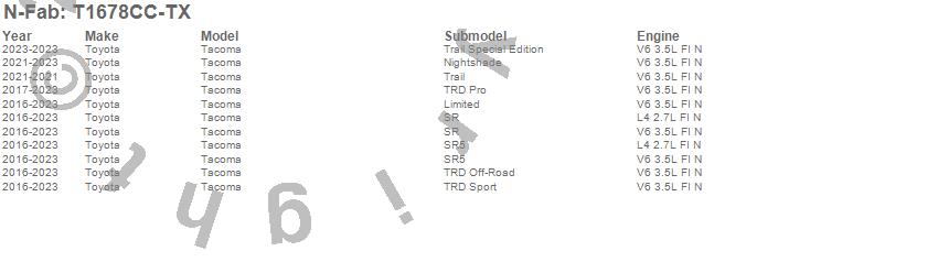 Below is an abbreviated list of applications for the Cab Length Nerf Step Bar.Tacoma, Toyota, 2023, 2022, 2021, 2020, 2019, 2018, 2017, 2016