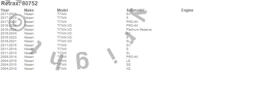 Below is an abbreviated list of applications for the RetraxPRO MX Retractable Tonneau Cover.TITAN, TITAN XD, Nissan, 2024, 2023, 2022, 2021, 2020, 2019, 2018, 2017, 2016, 2015, 2014, 2013, 2012, 2011, 2010, 2009, 2008
