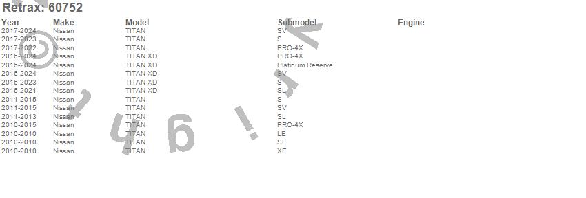 Below is an abbreviated list of applications for the RetraxONE MX Retractable Tonneau Cover.TITAN, TITAN XD, Nissan, 2024, 2023, 2022, 2021, 2020, 2019, 2018, 2017, 2016, 2015, 2014, 2013, 2012, 2011, 2010