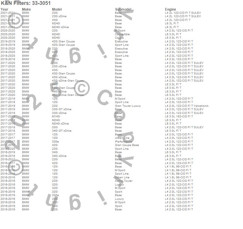 Below is an abbreviated list of applications for the Air Filter.120i, 220i, 230i, 230i xDrive, 320i, 330e, 330i, 330i GT xDrive, 330i xDrive, 340i, 340i GT xDrive, 340i xDrive, 420i, 420i Gran Coupe, 430i, 430i Gran Coupe, 430i xDrive, 430i xDrive Gran Coupe, 440i, 440i Gran Coupe