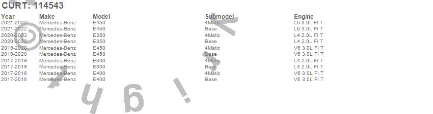 Below is an abbreviated list of applications for the Class I 1.25 in. Receiver Hitch.E300, E350, E400, E450, Mercedes-Benz, 2023, 2022, 2021, 2020, 2019, 2018, 2017