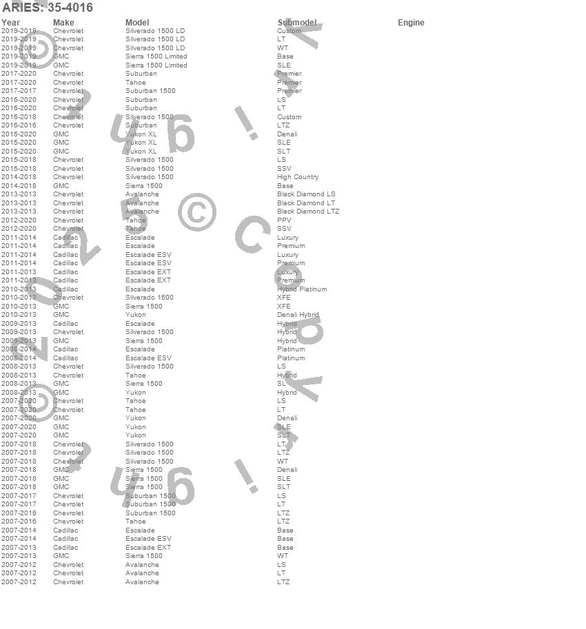 Below is an abbreviated list of applications for the Bull Bar.Avalanche, Escalade, Escalade ESV, Escalade EXT, Sierra 1500, Sierra 1500 Limited, Silverado 1500, Silverado 1500 LD, Suburban, Suburban 1500, Tahoe, Yukon, Yukon XL, Cadillac, Chevrolet, GMC, 2020, 2019, 2018, 2017
