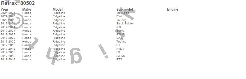 Below is an abbreviated list of applications for the RetraxPRO MX Retractable Tonneau Cover.Ridgeline, Honda, 2026, 2025, 2024, 2023, 2022, 2021, 2020, 2019, 2018, 2017