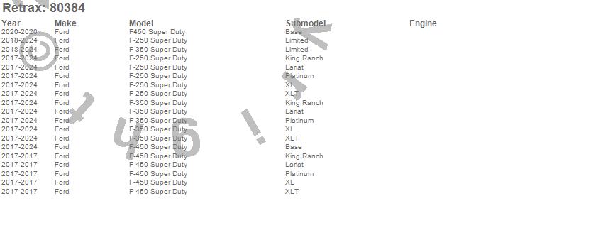 Below is an abbreviated list of applications for the RetraxPRO MX Retractable Tonneau Cover.F-250 Super Duty, F-350 Super Duty, F-450 Super Duty, F450 Super Duty, Ford, 2026, 2025, 2024, 2023, 2022, 2021, 2020, 2019, 2018, 2017
