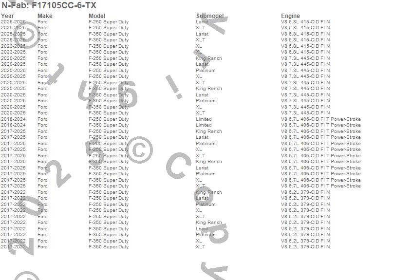 Brand: N-FabPart Number: F17105CC-6-TXNerf/Step Bar (Wheel to Wheel) Type: Textured Black - 6 Step - Special OrderUPC: 843206110445