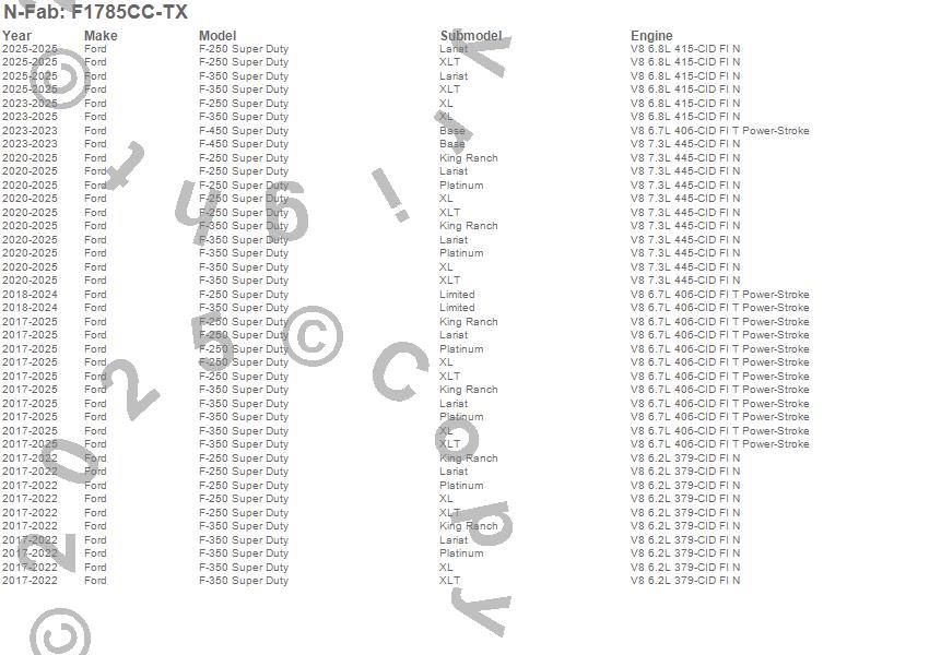 Below is an abbreviated list of applications for the Cab Length Nerf Step Bar.F-250 Super Duty, F-350 Super Duty, F-450 Super Duty, Ford, 2026, 2025, 2024, 2023, 2022, 2021, 2020, 2019, 2018, 2017
