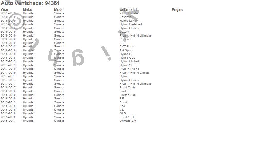 Below is an abbreviated list of applications for the Ventvisor Deflector 4 pc..Sonata, Hyundai, 2019, 2018, 2017, 2016, 2015
